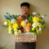 Trái cây đa dạng với nho xanh, táo đỏ, cam – quýt, lê vàng và các loại trái đặc sản nhiệt đới tạo nên bảng màu rực rỡ, tượng trưng cho sự đầy đủ, may mắn và thịnh vượng. Điểm nhấn từ các sản phẩm quà tặng kèm như bánh, kẹo hoặc mứt mang lại sự phong phú cho giỏ quà, thích hợp làm quà biếu cao cấp.