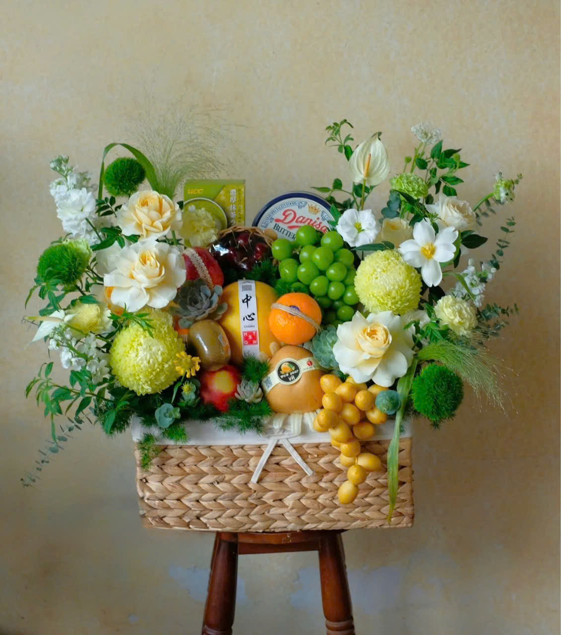 GOLDEN BLOOM DELUXE FRUIT HAMPER mang sắc thái tươi sáng với tông vàng – trắng – xanh làm chủ đạo, tạo nên tổng thể sang trọng, thanh lịch và đầy sức sống. Sự kết hợp của hoa hồng kem, cúc mẫu đơn vàng nhạt, lily trắng và các mảng foliage xanh giúp giỏ quà trở nên hài hòa, tinh tế và vô cùng thiện cảm.