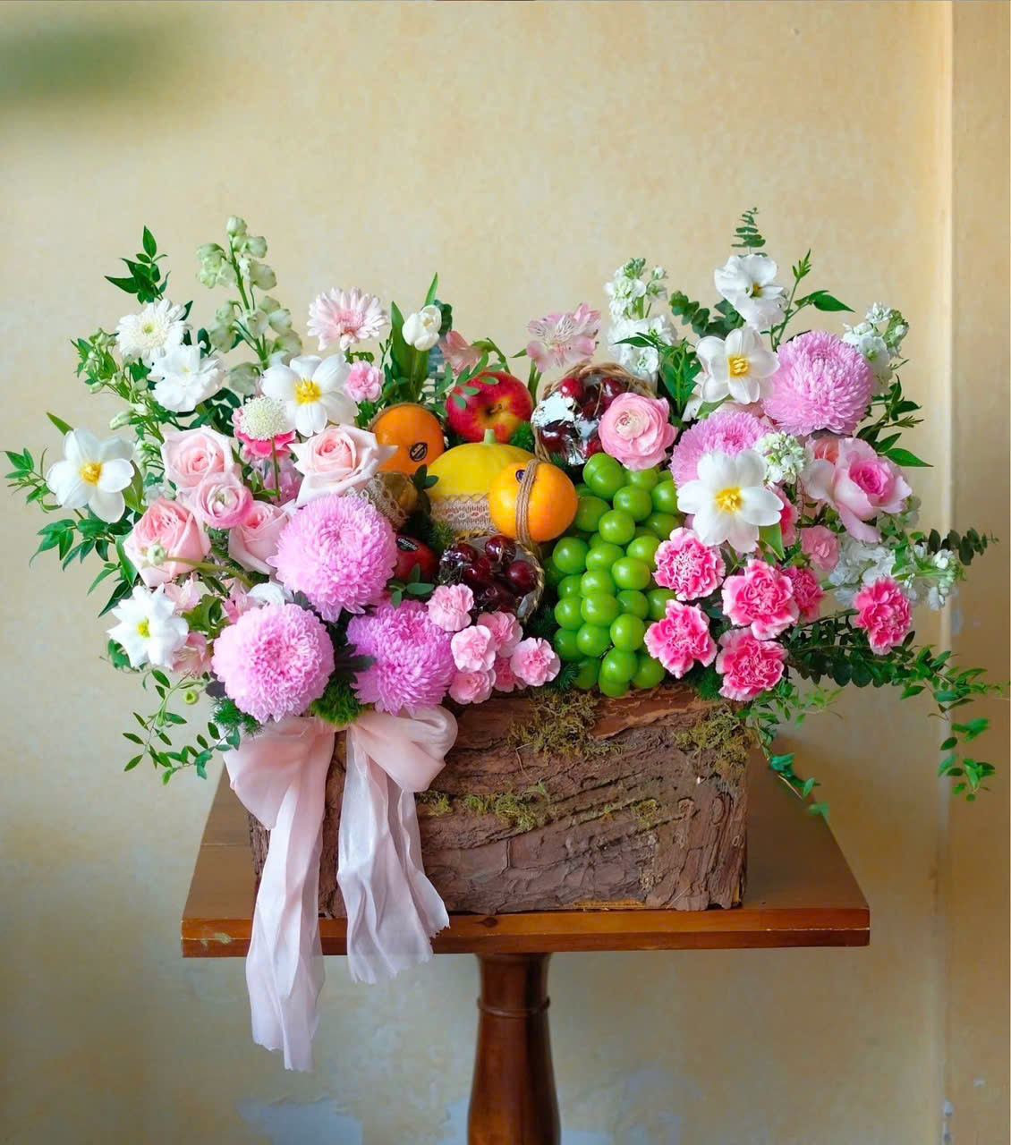 ROSY WHISPER FRUIT BASKET là sự kết hợp tinh tế giữa sắc hồng ngọt ngào của hoa và sắc xanh tươi mát của trái cây, mang đến cảm giác nhẹ nhàng, tràn đầy năng lượng và yêu thương. Tông màu pastel chủ đạo gợi lên nét nữ tính, trong trẻo, tượng trưng cho niềm vui, hạnh phúc và lời chúc tốt lành dành cho người nhận.