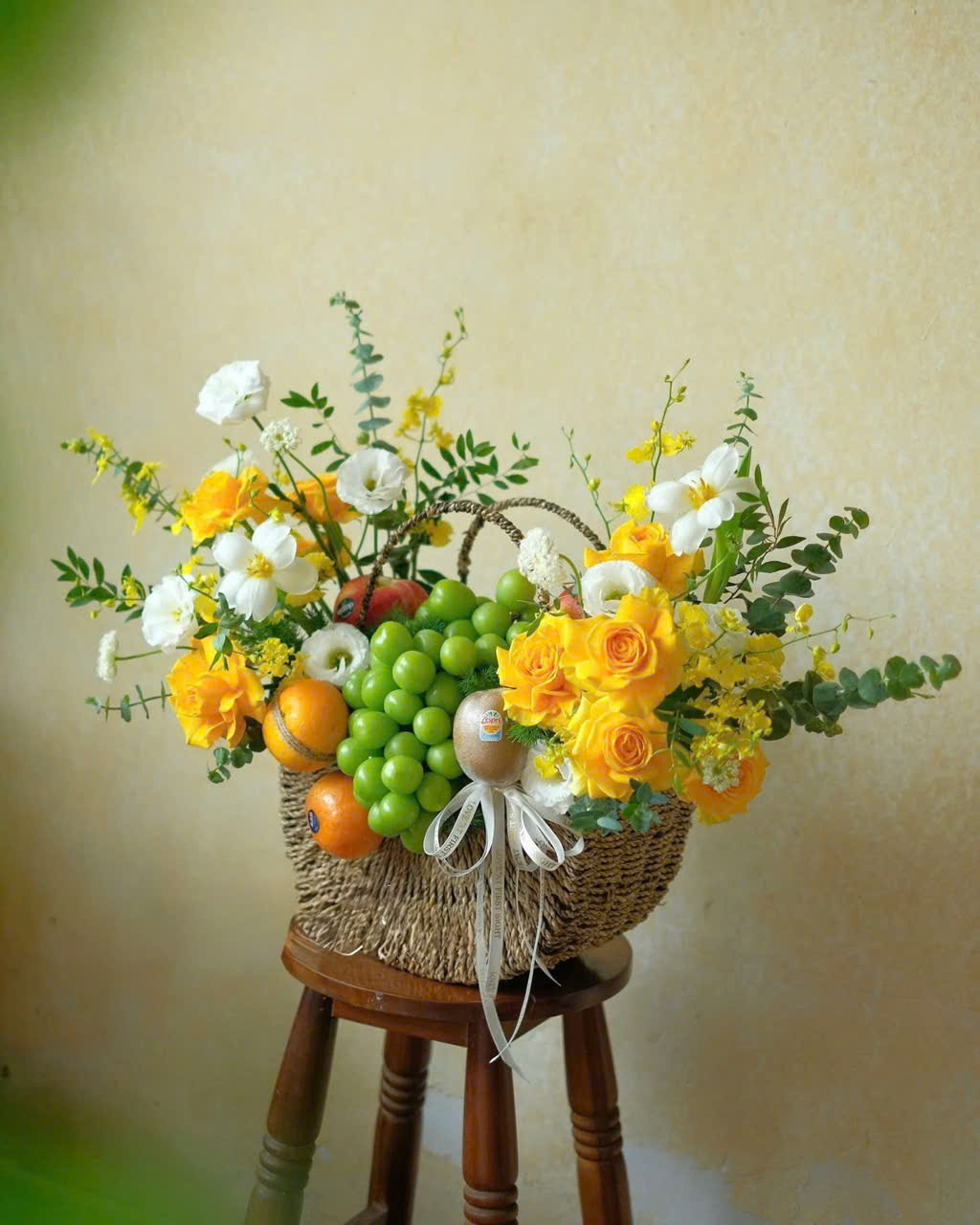 SUNNY BLOOM FRUIT BASKET là sự hòa quyện tinh tế giữa những trái cây nhập khẩu tươi ngon và hoa tươi rực rỡ sắc vàng – trắng, được sắp đặt khéo léo trong giỏ mây tự nhiên. Sắc vàng của hoa hồng và hoa lan tượng trưng cho thịnh vượng, may mắn và niềm vui tràn đầy ánh nắng, hòa cùng sắc trắng thanh khiết mang đến cảm giác an lành, tinh khôi và lời chúc tốt đẹp.