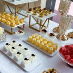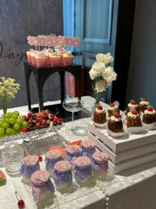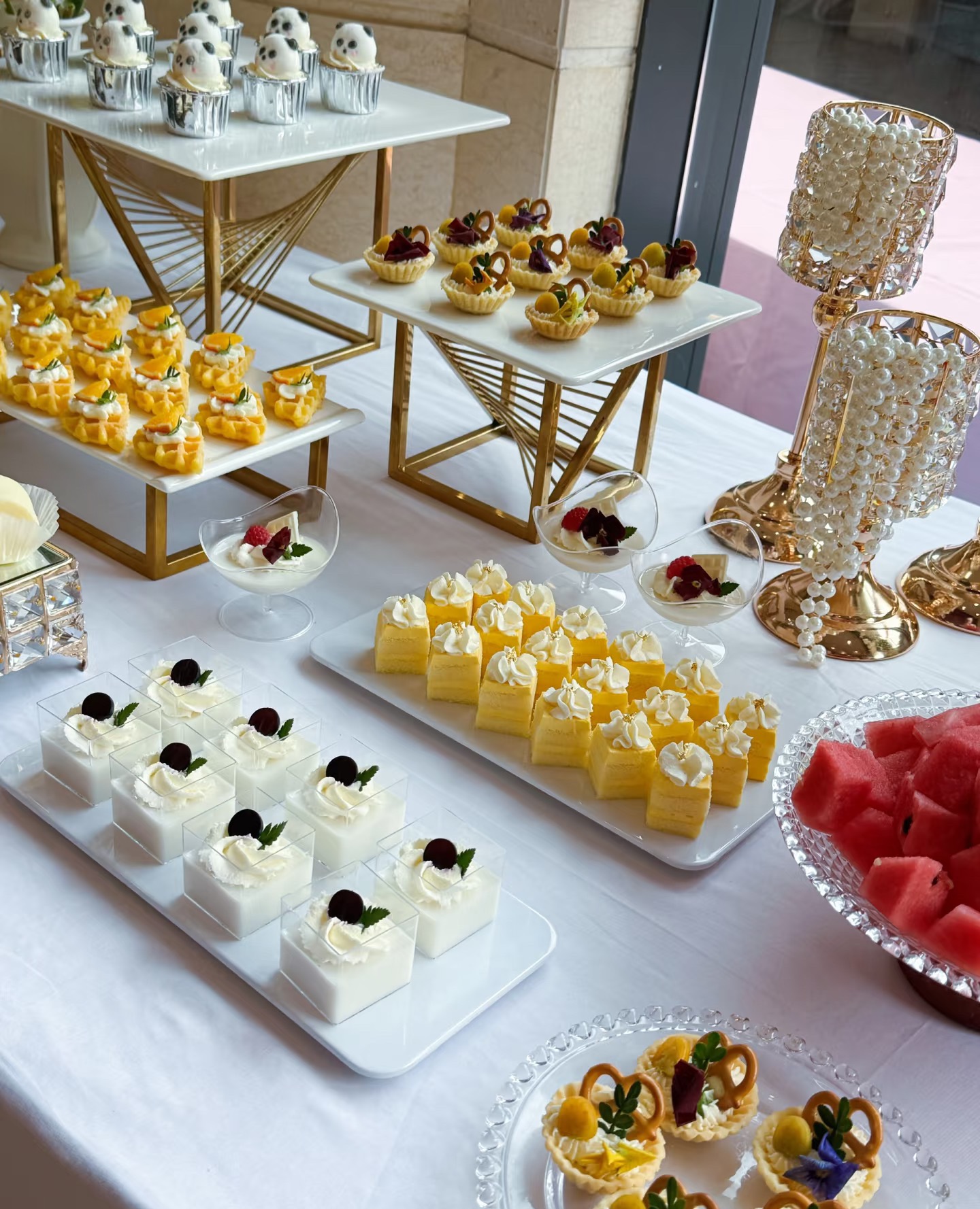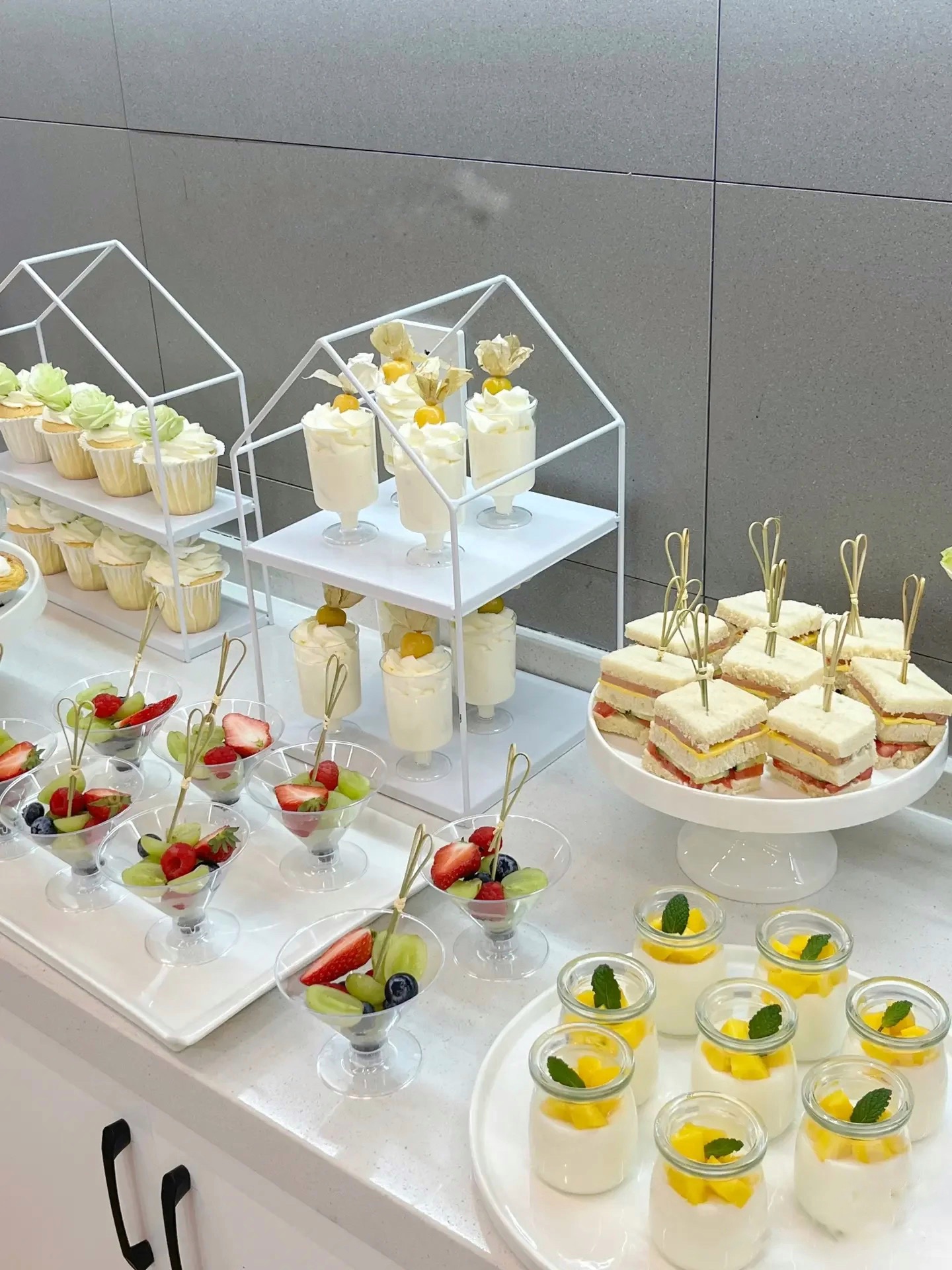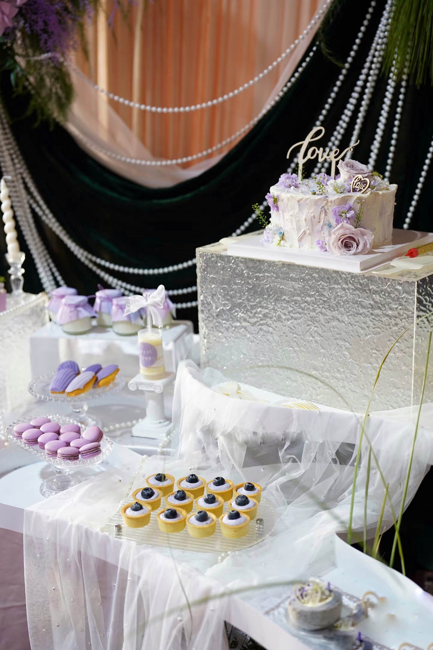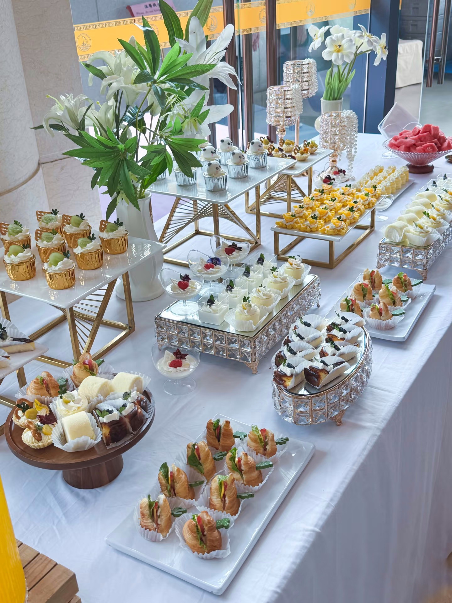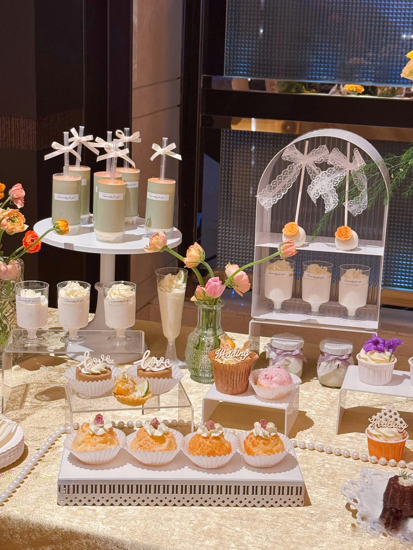 Chúng tôi chuẩn bị các món ăn nhẹ như bánh ngọt, trái cây tươi, nước ép và trà hoa quả được chọn lọc kỹ lưỡng. Tất cả đều được bày trí đẹp mắt, hài hòa với concept tiệc cưới, mang lại cảm giác ấm cúng và sang trọng cho khách mời.